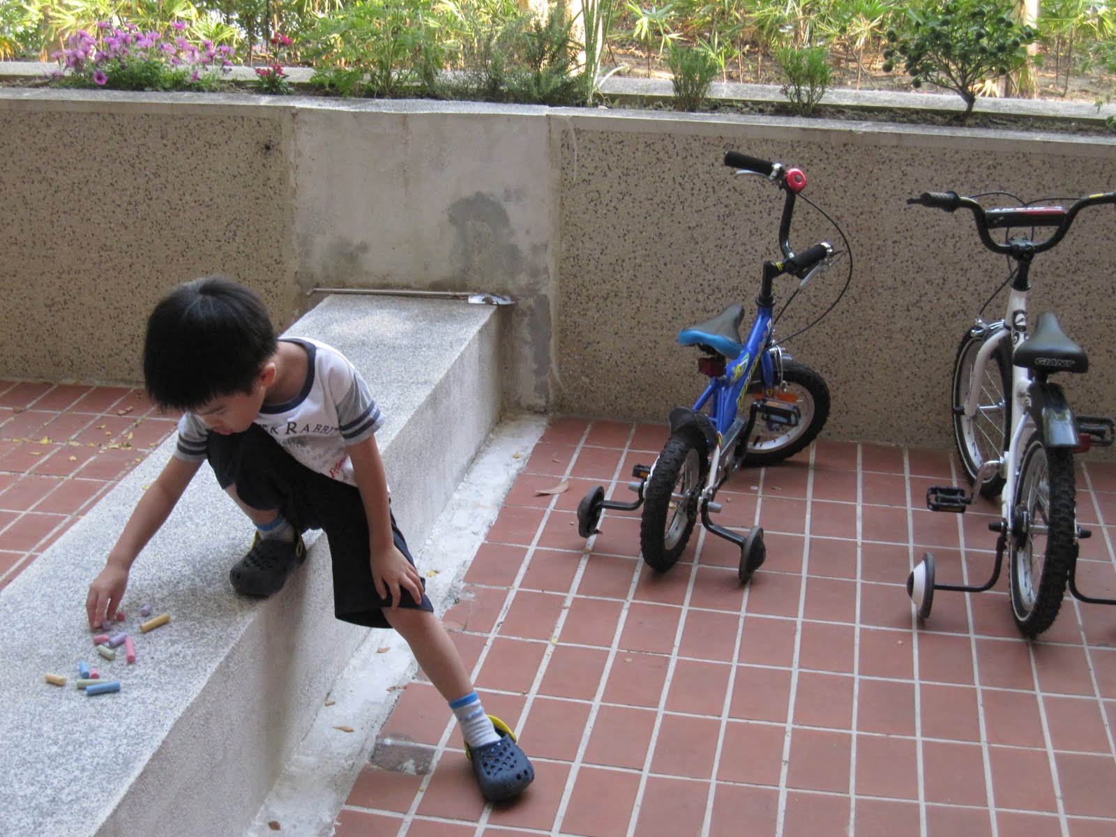 隔璧的廖博搬走了之後,我們現在都在兩間房屋裡自由穿梭,來不及外出散步時,兒子就在後院裡騎車,畫牆壁.